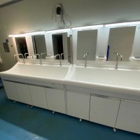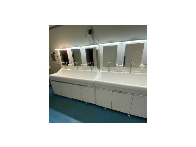 采用高分子材料一次吸塑成型,出水方式有:感应式、膝控式、脚踏式和手动开关,一台洗手池可客户要求选择单一出水方式或多种出水方式。洗手池分高背和低背,高背总高度1800mm,配有镜,照明灯,皂液器,可按客户要求配置烘手器和热水器。低背板无配置。