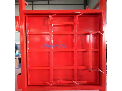 矿用防火防火密闭门主要由以左右门扇、上横梁(1百*60矩形钢管)、门框、下横梁,连杆、拉手、配重桶、导线轮、滑轮架及滑轮组成。