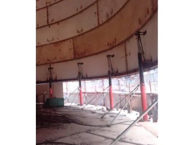 5、注意由于此时刚换完吊点后,钢内筒的提升吊点位于筒体重心下部,筒体处与“头重脚轻”状态,为防止提升时筒体发生晃动或倾斜,所以要有一套的止晃措施。