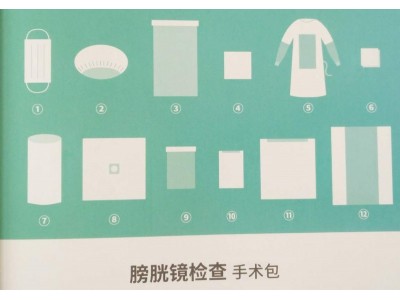 手术包配置:一次性使用医用口罩1个、一次性使用帽1个、器械盘套1条、擦手巾(40*40cm)4块、一次性使用手术衣(加强型)2件、纱布块10片、脚套2双、微型单1条、臀垫单1条、边单(75*90cm)3条、边单(150*150cm)1条、一次性使用包布1条。
