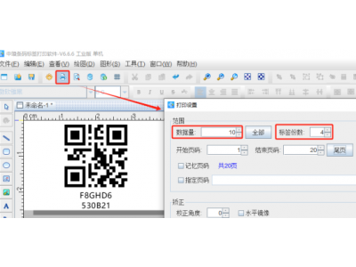 4.点击软件顶部的“打印”按钮,设置数据量(标签总个数)、标签份数(每个标签重复打印的个数)设置为4,开始页码(从那一页开始打印)、结束页码(到那一页结束打印),打印到切换到“打印机”,点击下面的“打印”按钮,软件中会出现一个输入提示框,用扫码枪将已有的二维码内容扫描进去之后,打印机中就会即时打印出来4个相同内容的二维码标签,直到最后一个二维码扫描完成之后,输入提示框就自动消失了。